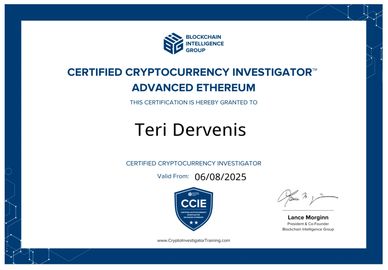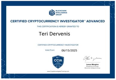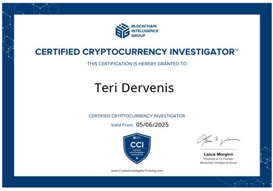 Certificate of Completion in Tracing Cryptocurrency in Money Laundering, demonstrating advanced expertise in blockchain forensics, crypto transaction tracing, AML investigations, and financial crime analysis for litigation and law enforcement support.
