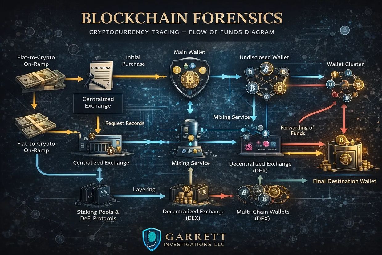 Garrett Investigations LLC delivers litigation-ready blockchain forensics, including cryptocurrency tracing, wallet attribution, and flow-of-funds analysis. We identify exchange exposure, detect fraud patterns, and provide clear, evidence-based reports to support attorneys in digital asset cases and investigations.
